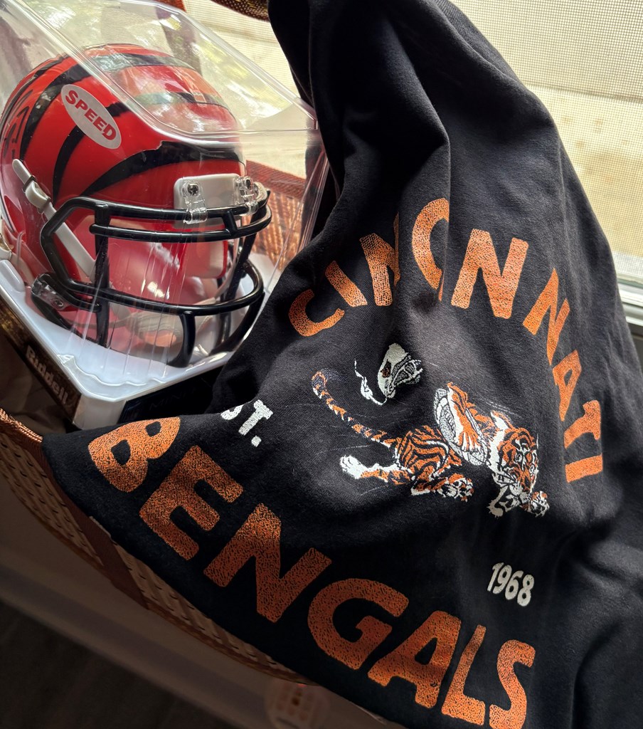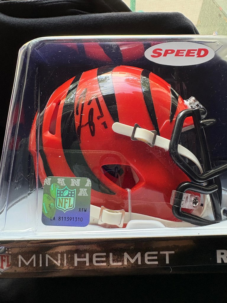 Mini Bengals helmet signed by Joe Burrow (pre-Turf Toe!) and another by rival Buffalo QB Josh Allen. They meet head-to-head here nestled in a Bengals shirt — hey, we’ll take whatever edge we can. Who Dey! $500 value