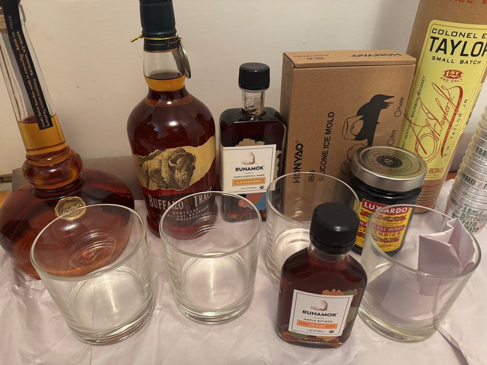Colonel E.H Taylor, Jr. Kentucky Bourbon Whiskey (750 ml), Honyao silicone ice mold, Luxardo Maraschino Cherries, Runamok maple cocktail bitters, Buffalo Trace Kentucky Straight Bourbon Whiskey, Willet Bourbon Whiskey, four bourbon glasses. $250 value
