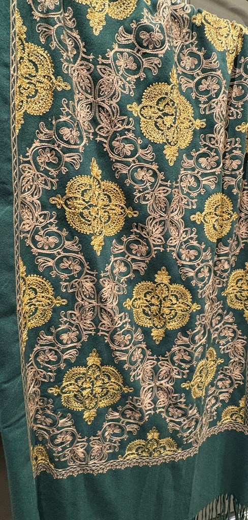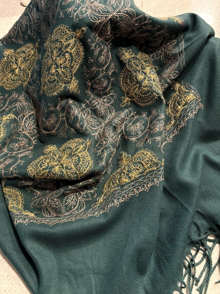 Bring the magic of Indian nights alive when draped in this elegant full-length, lighter-weight shawl replete with gold metallic threads woven into a stunning exotic motif. The photos can’t do it justice—you’ll have to see it for yourself, so prepare to be captivated! Shipping not available. $85 value