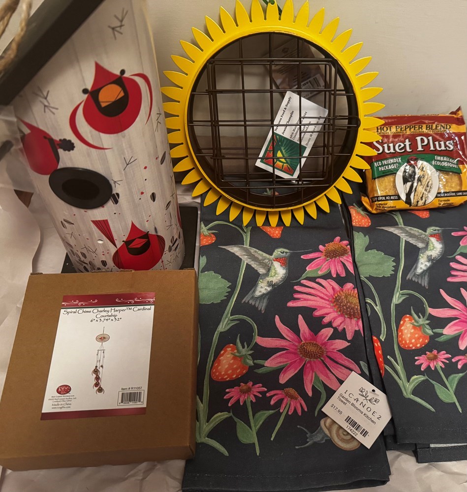 Feed the birds with whimsy! Included in this nature lovers basket is a Charlie Harper bird feeder, metal sun suet feeder with suet, and Charlie Harper wind chimes. Bring the nature theme inside with two dish towels decorated in hummingbirds and flowers. $135 value